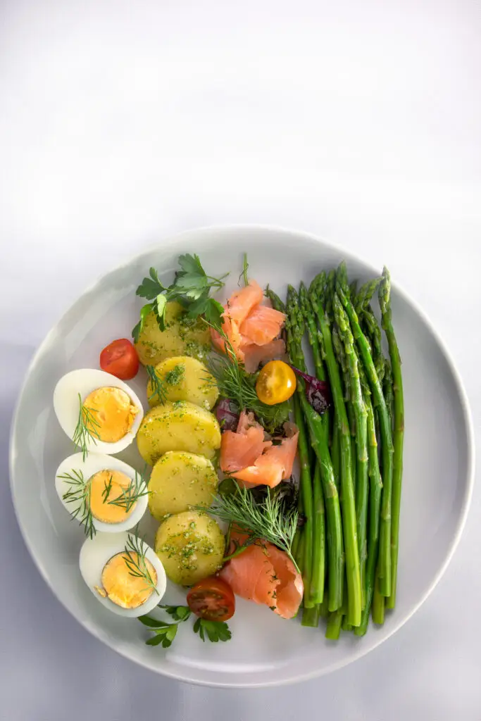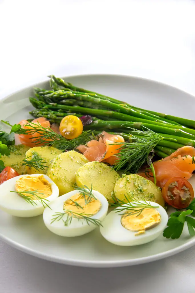 Seasonal combination for springtime. This salad can be used as a main source with a glass of white wine. Easy to make and present.